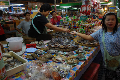 The chicken table! Most of us like, we just don't like where it comes from - chickens! Below there is another place selling fish. Many of the vendors sit up on the table towards the back, as you can see in the 3rd photo.