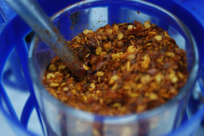 Below are are few images that are common place when sitting down to eat in Thailand. Forks and Spoons - already on the table. Thai's mainly eat with the spoon, the fork is used to push food onto the spoon; no, not all Asians use chopsticks. Thai's only use chopsticks for noodle dishes. The dry chilies are one of the 4 condiments that are always available. The other photo is of vinegar and chilies. There is always a condiment of fish sauce and chilies available as well.