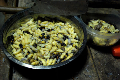 These are bee larvae, tasty right? .....not really.. I had one of the really light looking ones -it's like a small sack of thin custard that explodes in your mouth, the taste doesn't make up for the texture.
