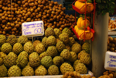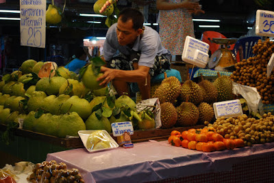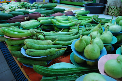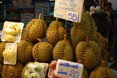 I'm sure some of you are glad to be done with the meat section. Well, here are some vegetables & fruit. To be honest I don't remember the names of most these things. The third picture is of Durian, the famous, foul smelling fruit. Sometimes it smells really bad, other times it isn't so bad - I didn't notice it when walking by this stall. They don't let you travel with this stinky fruit and there are seperate ships designated to only carry this soft flesh within a thorny body.
