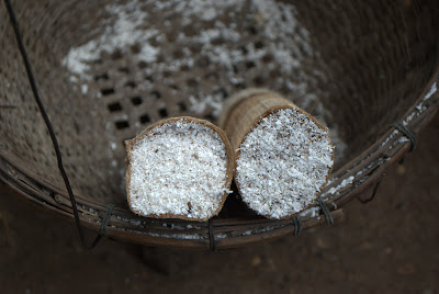 Limes. Sweet sticky rice in a bamboo casing topped with shredded coconut.